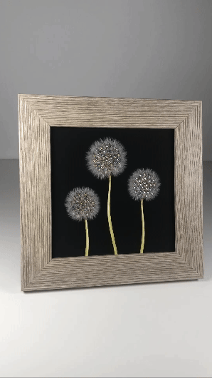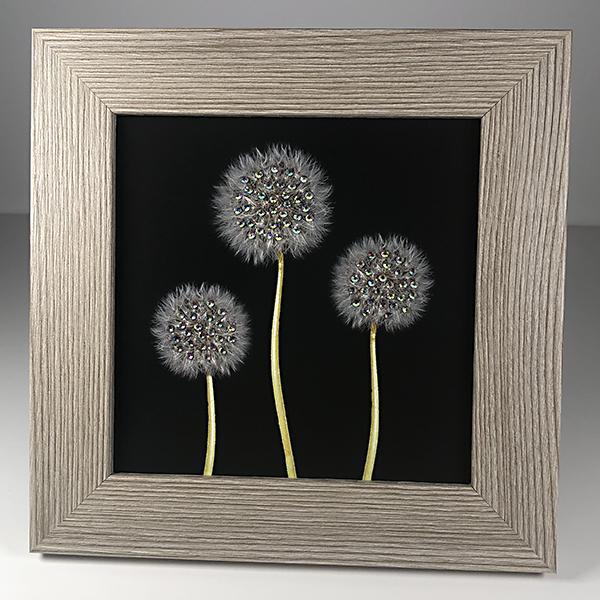 Trio of Dandelions 6"x6" print embellished with crystals and framed as pictured, overall size is 8"x8". Items are made to order and may take 4-6 weeks for delivery.